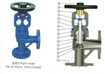 1.直角式截止閥的啟閉件是塞形的閥瓣,密封面呈平面,閥瓣沿流體的中心線作直線運動,介質(zhì)流向為45°(低進高出)